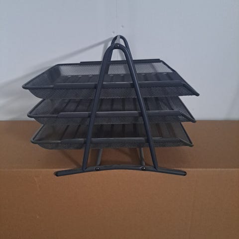 Metallinen kolmitasoinen paperilokerikko, väri harmaa. Lokerikossa on kolme päällekkäistä verkkomallista lokeroa A4-kokoisille papereille tai muille toimistotarvikkeille. Soveltuu työpöydän asiakirjojen ja paperien järjestämiseen kotona tai toimistossa.