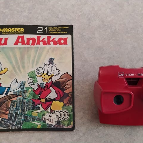 View-Master. Mukana 5 kpl pyöreitä View-Master -kuvakiekkoja, jotka asetetaan laitteen yläosassa olevaan aukkoon. Laitteessa on vipu kuvien vaihtamista varten ja kaksi katseluaukkoa stereokuvien tarkasteluun. Soveltuu View-Master -kuvakiekkojen katseluun ja kokoelmakäyttöön.