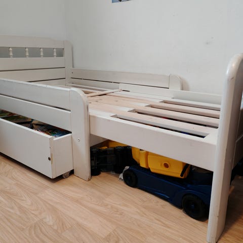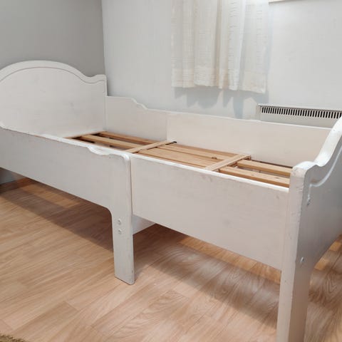 Jatkettava (lasten) sänky. Sängyssä on puinen valkoiseksi maalattu runko ja puinen pohjalevy. Pituutta voi säätää lapsen kasvaessa. Soveltuu lapselle, joka siirtyy pinnasängystä tavalliseen sänkyyn. Patjan leveys 80cm ja pituus 110...200cm. Patja ei sisälly ilmoitukseen, vaan se tulee hankkia erikseen.