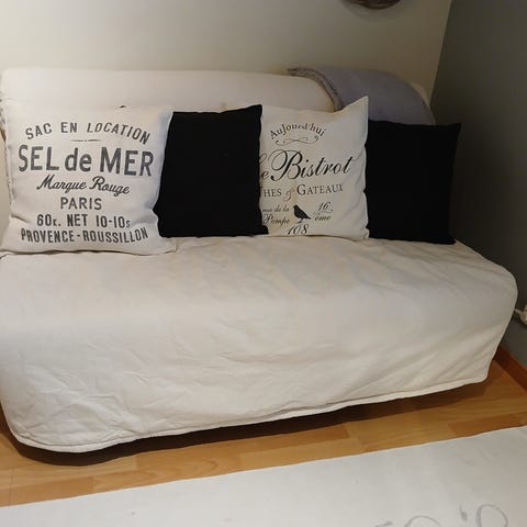 Kätevä Ikea Lycksele vuodesohva, joka on helppo muuntaa sängyksi. Leveys 140 cm ja sänkynä 140x190 cm. Harmaa päällinen patjassa ja mustat metallijalat. Päällä valkoinen verhoilukangas, jossa muutamia tahroja - suositellaan pesua alkuun. Moderni retrotyyli, joka sopii monenlaisiin sisustuksiin. Käytännöllinen valinta pieniin tiloihin.