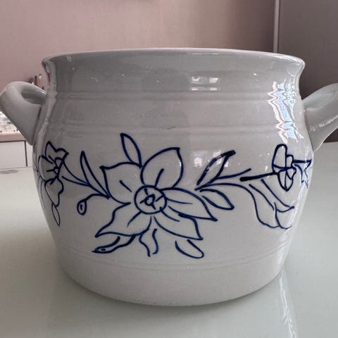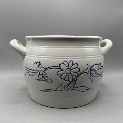 Arabia voipytty, jossa on sininen kukkakuviointi. Piippuleima pohjassa.