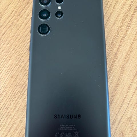 Samsung Galaxy S23 Ultra älypuhelin, tallennustila 256 GB. Väri musta. Laite kuuluu Galaxy S23 -mallisarjaan ja on Ultra-versio. Sopii yleiseen älypuhelinkäyttöön, kuten puheluihin, viestintään, netin selailuun ja sovellusten käyttöön. Kuvissa näkyy puhelin ja myyntipakkaus.