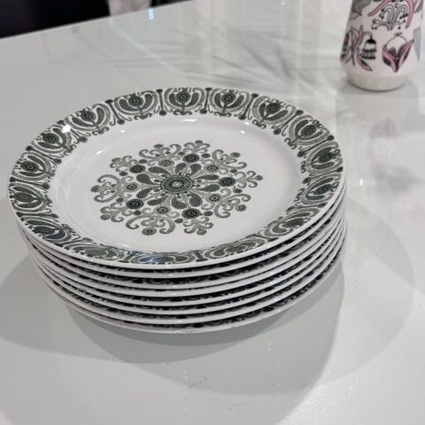 Arabia lautaset, joissa valkoinen pohja ja vihreä, ornamenttimainen koristekuvio lautasen reunassa ja keskellä. Lautaset sopivat esimerkiksi kattaukseen ruokalautasina tai tarjoiluun. Materiaalina lasitettu keramiikka/posliini. Kuviointi on symmetrinen ja toistuu jokaisessa lautasessa.