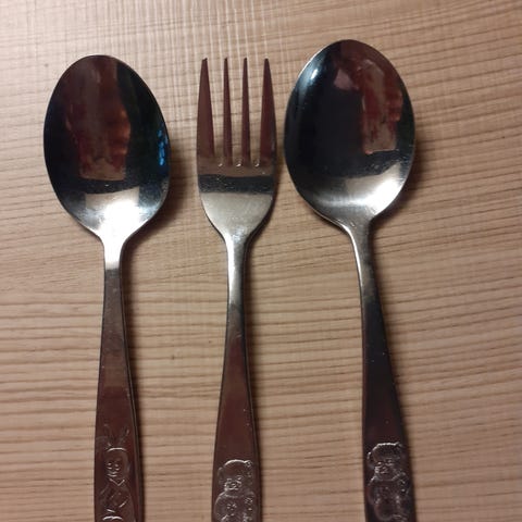 Lasten ruokailuvälineet, joissa on eläinaiheiset kaiverrukset. Yhteishinta.