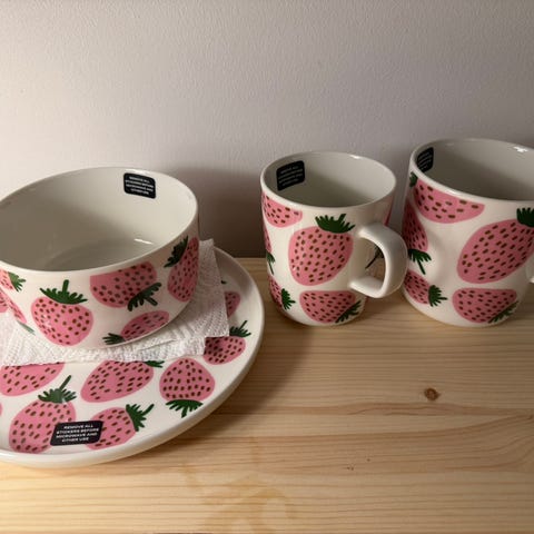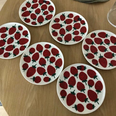 Marimekko lautaset mansikkakuviolla.