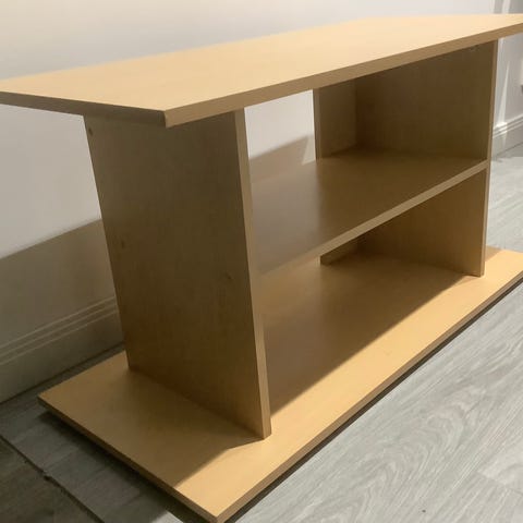 Perinteinen 1970-luvun TV-taso lehtitelineellä. Vain vähän pintavaurioita tasossa. Lehtitelinettä vähän korjailtu teipillä. Jalkaosan saa irti ja nippuun kuljetuksen ajaksi.