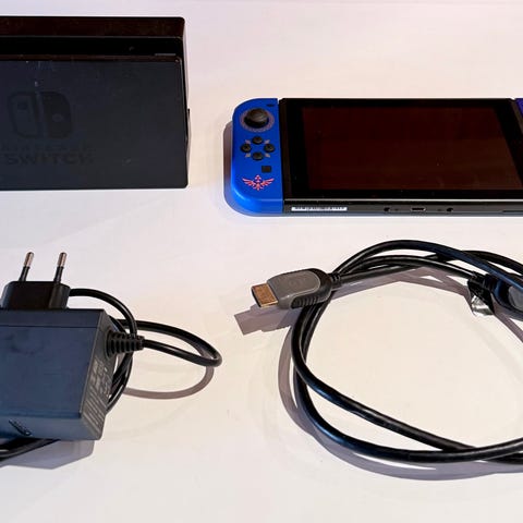 Mukana telakka TV-pelaamista varten, virtalähde, HDMI-kaapeli, Joy-Con -rannehihnat sekä kantokotelo konsolille.