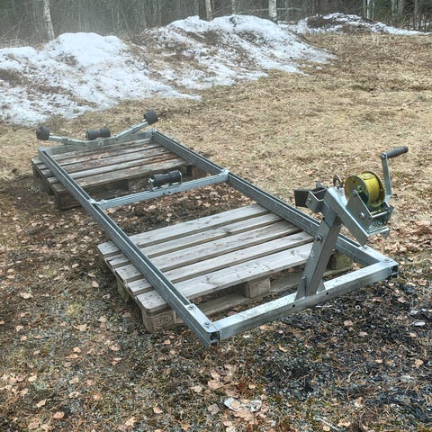 Myydään tukeva vinssillä varustettu siirtoteline. Sopii esimerkiksi veneen, moottorin tai muun raskaan tavaran siirtämiseen ja vetämiseen.