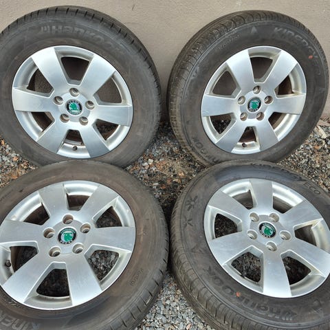 Skoda alumiinivanteet renkailla. Vanteissa viisi paksua puolan kaltaista sakaraa ja keskellä Skodan merkki. Renkaat ovat kesärenkaat, kulutuspinnassa näkyy kulumaa. Sopivat henkilöautoon, jossa on vastaava pulttijako ja koko. Myydään renkaat vanteilla -yhdistelmänä. Tarkemmat mitat ja tiedot kannattaa varmistaa paikan päällä renkaiden kyljestä ja vanteiden merkinnöistä.