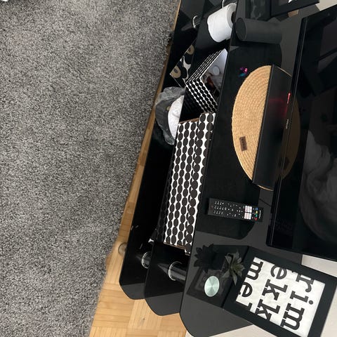 Annetaan pois sohvapöytä pinnijaloilla. Kansi on jonkinlaista ontoksi koverrettua puuta (en muista lajia) ja on muutaman vuoden aikana kiertynyt mutkalle (ks. kuva). Pinnijalat (3 kpl) ovat kuparin väriseksi maalattua metallia ja sopinevat käytettäväksi johonkin projektiin.