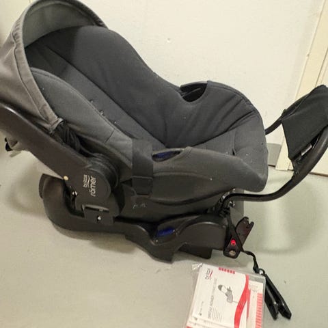 Britax Römer turvaustuin. Istuimessa on tukijalka ja kiinnityshihnat auton penkkiin tai penkin jalassa oleviin kiinnityslenkkeihin.