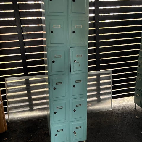 Teollinen Vintage-säilytyskaappi, kapea, 12-lokeroinen metallikaappi