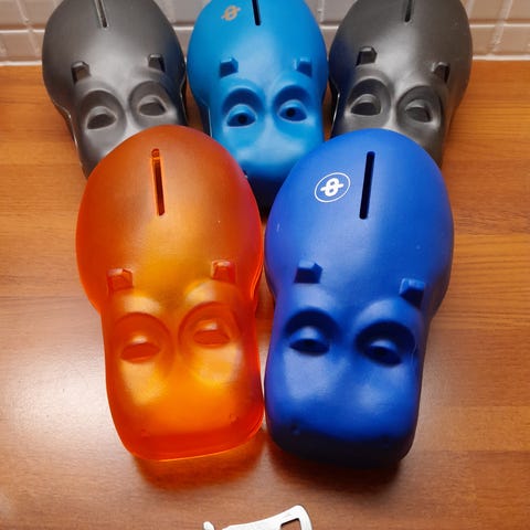 Osuuspankin pienet rahalippaat 1980-luvulta. Kertakäyttöinen malli, josta irrotettiin takaosa pankissa lipasta tyhjentäessä.