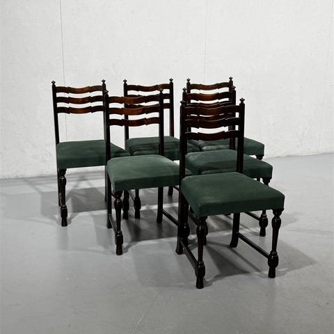 Tuoleissa on havaittavissa käsinojissa kulumaa ja verhoilussa on takana repeämiä. Runkoehjät ja tukevat istua.