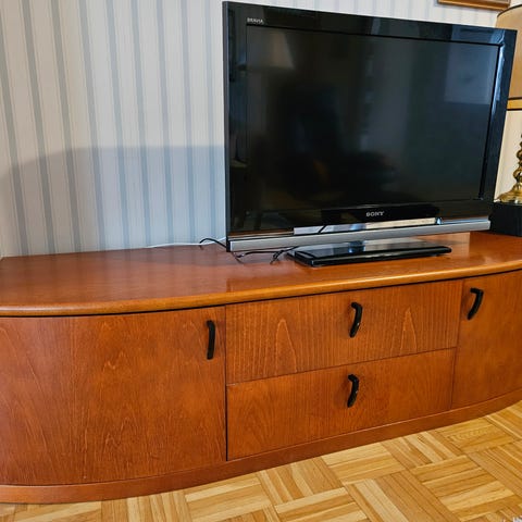 Tukeva puinen tv-taso lasi ovilla. Ainut virhe vetolaatikon reunassa pieni kolhu, näkyy kuvassa.