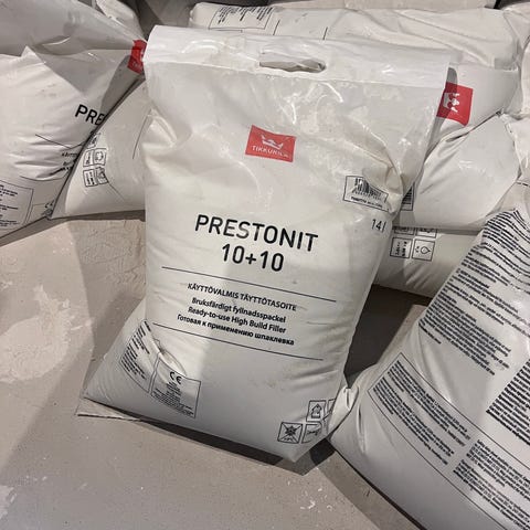 Weber ja Goldband tasoite- ja laastisäkit, kaikki säkit avattuja ja puolillaan. Kaikki myynnissä kerralla, hinta koskee siis koko paketti. Sisältää 1/2 pussia eli n. 10 kg: Weber L pohjatasoite ja Weber LR -pintatasoite, Goldband-kipsilaasti sekä 1/2 pussia eli n. 2,5 kg sementtipohjainen Mapei Plan r35 tasoitelaasti. Sopivat esimerkiksi seinien ja kattojen tasoitukseen ja oikaisuun sisätiloissa. Tarkempi määrä, paino ja mahdollinen avaamisaste vaihtelevat säkeittäin, mutta kaikki on noin puolillaan. Vain nouto!