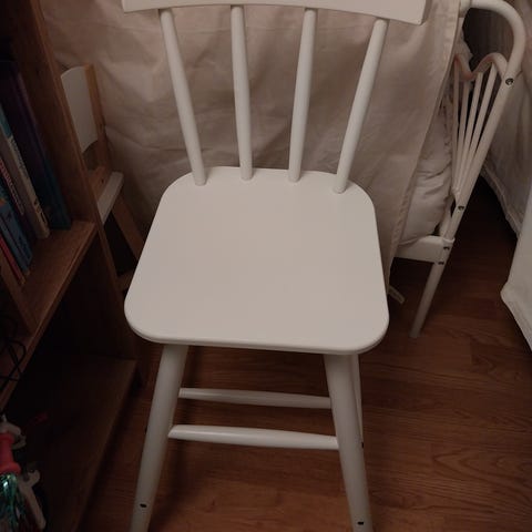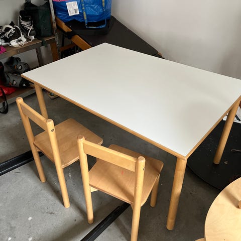 IKEA lastensetti, johon kuuluu suorakulmainen valkoinen pöytä ja kaksi valkoista lastentuolia. Tuoleissa on selkänojassa koristekuvio, joka ajan myötä hieman kellastunut. Kuvissa näkyy joitakin käytön jälkiä, kuten pieniä naarmuja ja kulumista reunoissa.