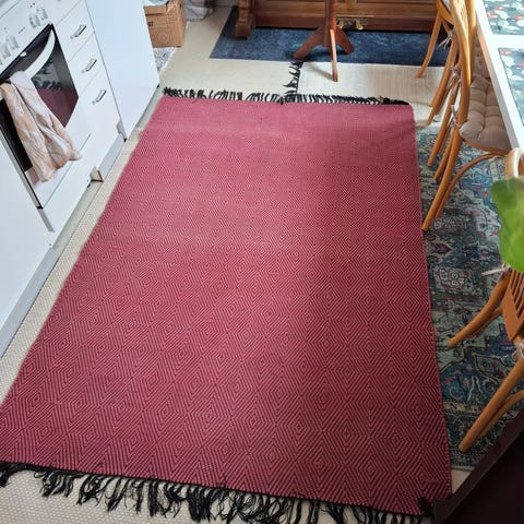Ellokselta ostettu puuvillainen matto, jossa harmaa-valkoinen painokuvio. Maton koko on n. 146x206 cm. Yksi pieni tahra ks. viimeinen kuva, muuten hyvässä kunnossa. Ohjeen mukaan maton voi pestä 40-asteen pesussa. Nouto Espoon Mankkaa tai tori diili.
