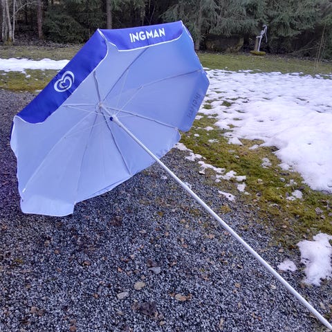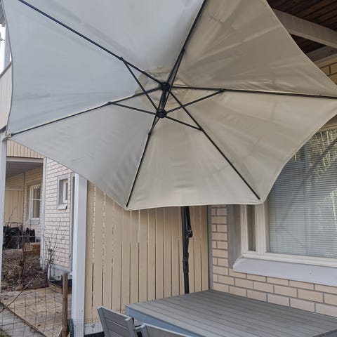 Myydään valkoinen aurinkovarjo parvekkeelle tai pihalle.Toimiva avausmekanismi. Halkaisija 2 metriä.Runko säädettävissä.Säilytetty talvet lämpöisessä varastossa.Nouto.