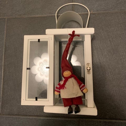 Punottu lyhty, jossa sisällä irrotettava lasisäiliö kynttilälle. Materiaalina luonnonsävyinen punos ja metallinen runko, joka tukee rakennetta.