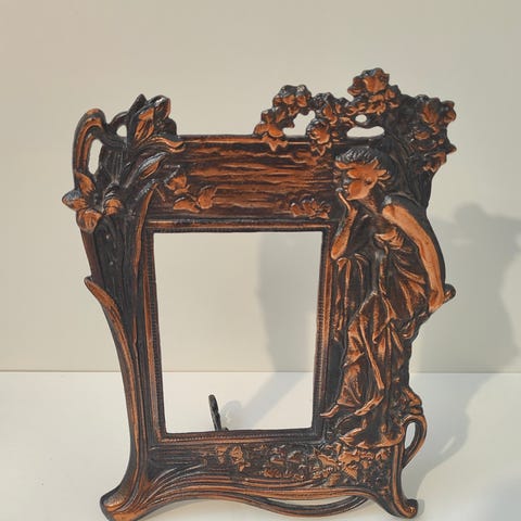 Hopeinen aito vintage valokuvakehys, jossa kohokuvioitu kukkakoriste yläreunassa. Kehyksestä löytyy hopeleima