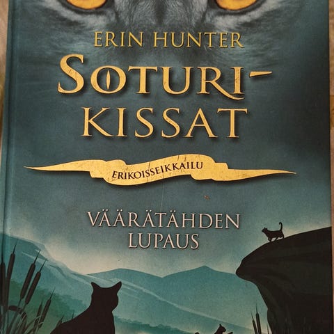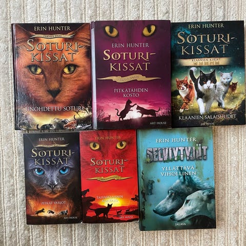Erin Hunter Soturikissat -kirjasarja, kolme suomenkielistä kirjaa. Kovakantinen "Auringonlasku" ja kaksi muuta samaan sarjaan kuuluvaa pokkaria "Salaisuuksien metsä" ja "Villiin luontoon". Buorten fantasia- ja seikkailukirjoja, joissa seurataan kissaklaanien elämää. Kirjat sopivat erityisesti kouluikäisille ja nuorille lukijoille, jotka pitävät fantasiasta ja eläinaiheisista tarinoista.