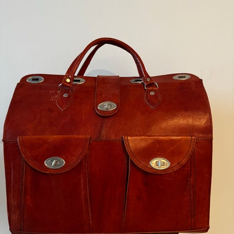 Ruskeaa patinoitunutta, paksua nahkaa. Pinnassa käytön jälkiä ja nahka on osittain käytössä pehmentynyt ( kulmat ). Soljet ehjät, samoin olkahihna, joka on irroitettava.