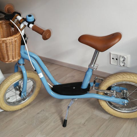 Seuraavalle pienelle pyöräilijälle, toimiva sini/hopea potkupyörä Footie.