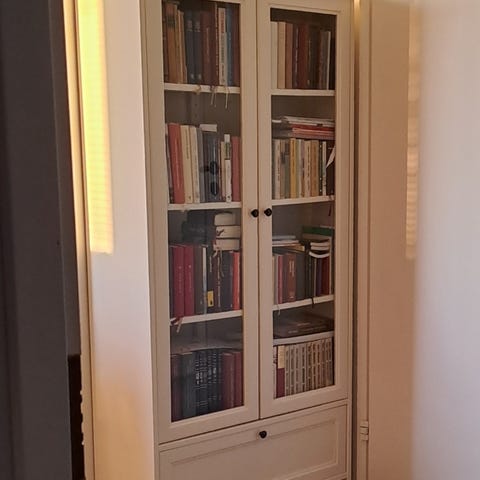 Valkoinen vitriinikaappi lasiovilla. Kaapissa on ylä- ja alaosa, molemmissa lasiovet ja useita hyllyjä esineiden säilytykseen ja esillepanoon. Sopii esimerkiksi astioiden, koriste-esineiden tai lasien säilyttämiseen olohuoneessa tai ruokailutilassa. Kaapissa on puunväriset vetimet ovissa ja se on suunniteltu sijoitettavaksi seinää vasten.