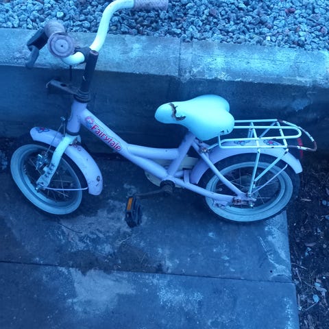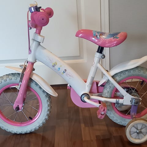 Lasten polkupyörä 12" renkailla. Rungon pääväri on pinkki pientä ruostetta löytyy. Mutta toimii kuitenkin hyvin.
