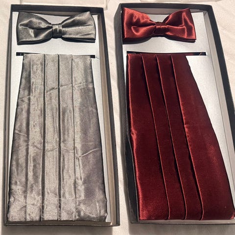 Miesten musta smokkisetti, johon kuuluu smokkipuvun kanssa käytettävä säädettävä vyötäröliivi ja säädettävä rusetti. Molemmat ovat mustaa, kiiltäväpintaista polyesteria. Alkuperäinen laatikko tulee mukana