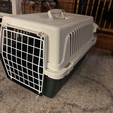 Muovinen kantokoppa eläimelle, esimerkiksi kissalle tai pienelle koiralle. Kopassa on metallinen etuovi, ilmanvaihtoaukot sivuilla ja päällä sekä kantokahva kannessa. Väri on siniharmaa. Sopii lemmikin kuljettamiseen autossa tai lyhyillä matkoilla. Tämä kantokoppa on ollut vuosia ulkona avonaisessa varastossa, vaatii hyvän puhdistuksen. Ainoastaan nouto Porista Vanhaltakoivistolta.