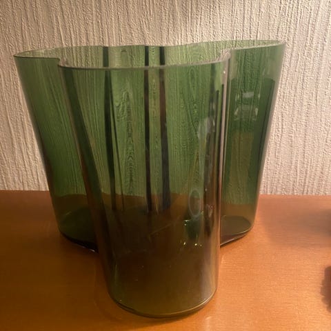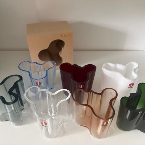 Punainen, numeroitu Aalto maljakko 55mm. Mukana puukotelo. Täysin ehjä, ei naarmuja, reunat täysin ehjät. I-tarra hieman haalistunut.