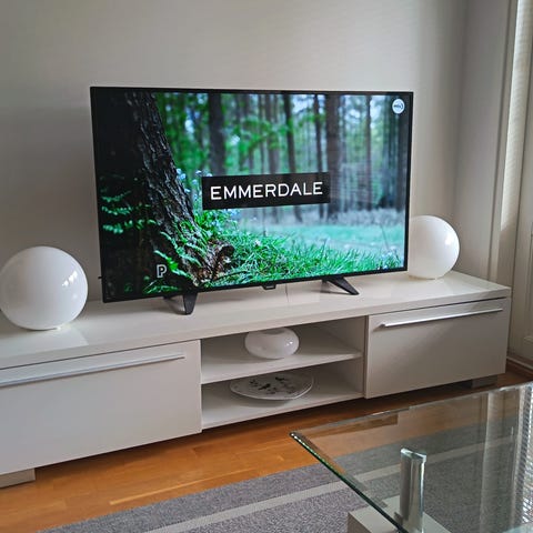 Korkeakiiltoinen, valkoinen tv-taso kolmella laatikolla.