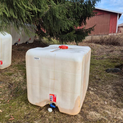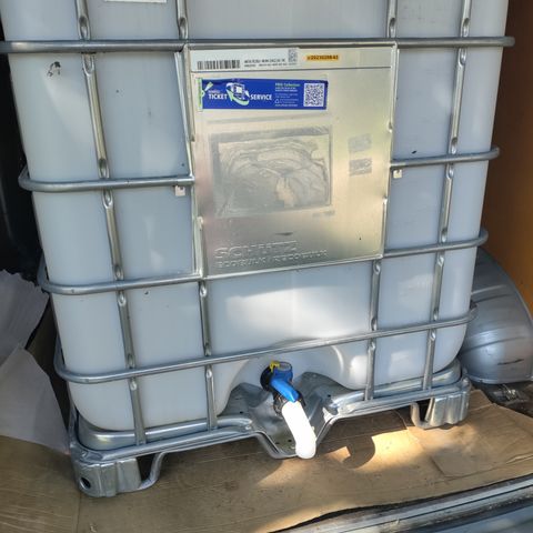 IBC-vesisäiliö, jossa metallikehikko ja muovinen sisäsäiliö. Ylhäällä suppilo ja irrotettava suodatinyksikkö estämään roskien pääsyä. Säiliölle on erillinen filmivanerinen suojakotelo, jossa aukko suppiloa varten. Alhaalla on hana ja liitin veden laskemista ja letkun kiinnittämistä varten. Soveltuu sadeveden keräämiseen. Säiliö+ suodatin 60e, suojakotelo 60e. Yht 110e