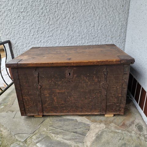 Kaunis, tumma patina sekä puu- että metalliosissa.