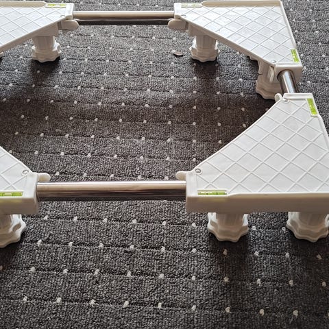 AEG pesukoneen korotus- ja väliasennussarja. Valkoinen asennuskehikko, joka on tarkoitettu pesukoneen alle tai pesukoneen ja kuivausrummun väliin. Soveltuu koneen korottamiseen ja mahdollistaa esimerkiksi vetolaatikon tai tason käytön koneen alla.