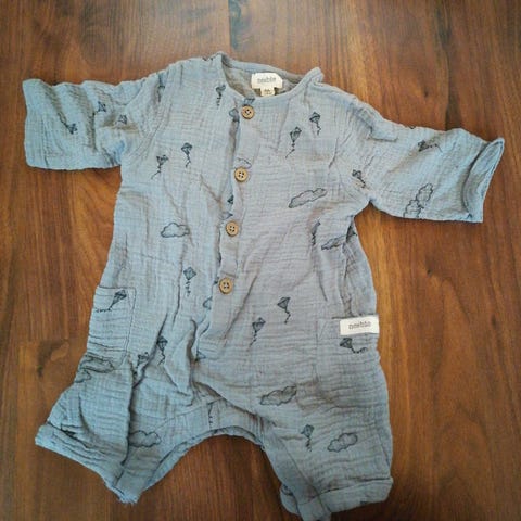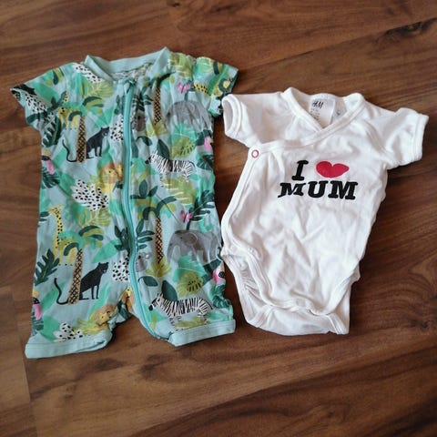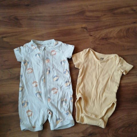 Raidalliset shortsit 50cm ja lyhythihainen vaaleanvihreä body koossa 56cm