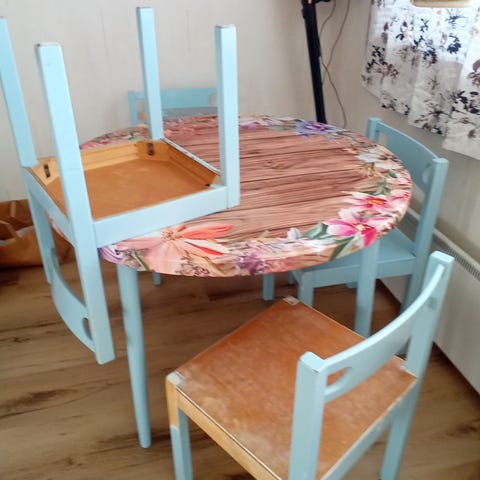 Annetaan puinen ruokapöytä. Pinta huonossa kunnossa.