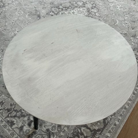 Muistaakseni aikanaan jyskistä ostettu pyöreä sohvapöytä. Hyvässä kunnossa, ollut säilytyksessä häkkivarastossa joten on hieman pölyinen.