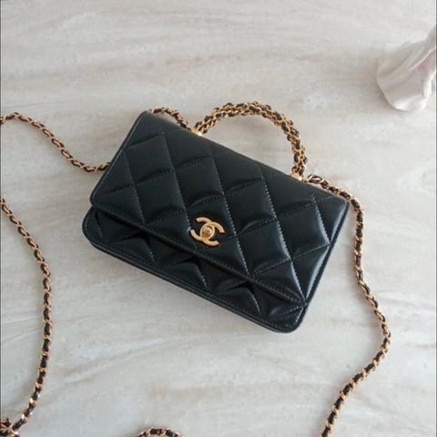 Tämä Chanelin upea Wallet On Chain on valmistettu metallinhohtoisesta samppanjankultaisesta lampaannahasta! Laukussa on vaalean kultaiset metalliosat ja etuosaa koristaa klassinen CC-logo.