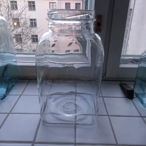 Myynnissä kuvassa oleva Karhulan Lasin valmistama kirkas keittiötölkki, jonka vetoisuus on 5 litraa. Mukana on myös kansi.