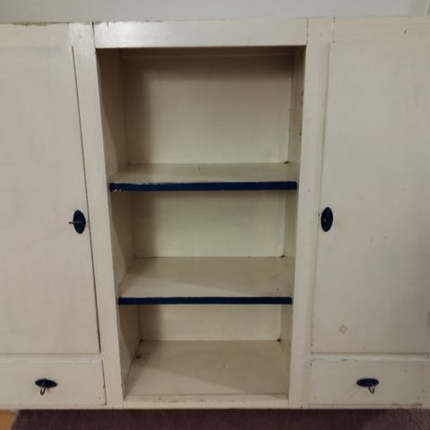 Itse maalattu valkoinen hylly. Hyllyjen korkeutta voi säätää. Ensimmäiselle hakijalle