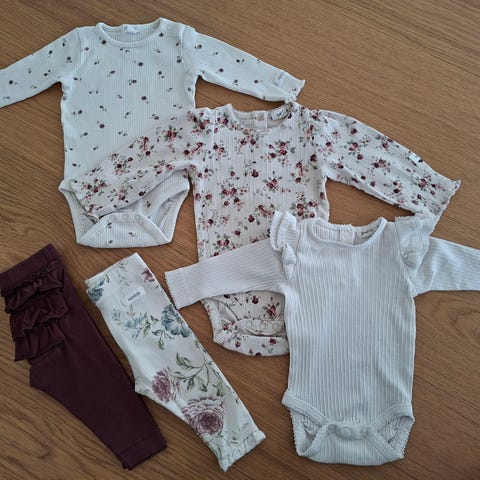Tyttövauvalle beige yöpuku, beige-valkoraidallinen body sekä vaaleanpunaiset röyhelöhousut. Kaikki siistikuntoisia.