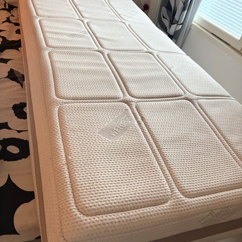 Jysk WellPur sänky- ja patjapaketti. Kokonaisuus sisältää WellPur-patjan, jossa on valkoinen, tikattu päällinen. Patja on suunniteltu tarjoamaan tasaisen makuualustan ja se soveltuu yhden hengen sänkyyn. Paketti sopii esimerkiksi makuuhuoneeseen, vierashuoneeseen tai opiskelija-asuntoon perusvuoteeksi. Tarkemmat mitat ja materiaalit voi varmistaa myyjältä.