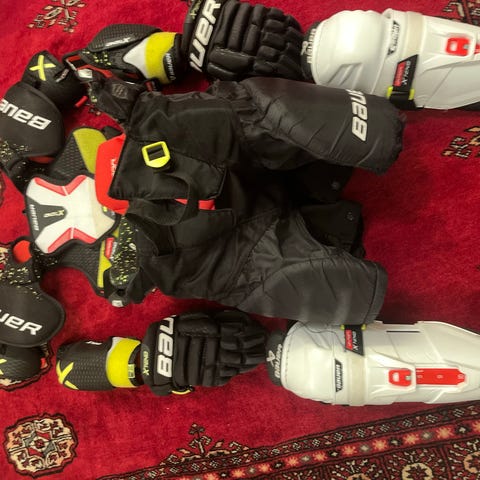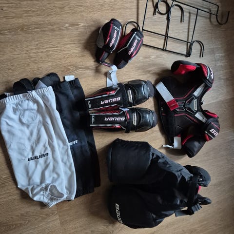 Jääkiekkovarustesetti junioripelaajalle. Kuvatun setin varusteisiin kuuluu useita eri merkkisiä suojia ja varusteita, kuten Bauer-säärisuojat (20cm) Reebok-yläkropansuoja (Yth M), Warrior-käsineet (23 cm) sekä Sher-Wood-jääkiekkohousut.