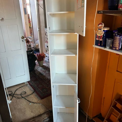 Koivuviilukaappi, Korkeus. 2,1 m, leveys 1m, syvyys 0.45 m. Kaapissa 6 hyllyä. Vain nouto Itä-Pasilasta.