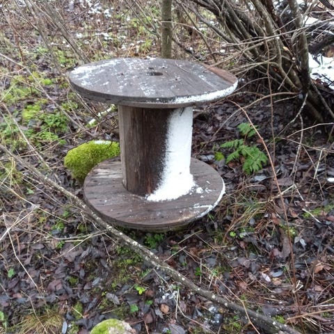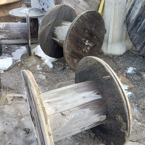 Puinen kaapelikela. Halkaisija 54 cm. Leveys/korkeus 47cm. Vähän likainen ja pölyinen, säilytetty ulkona, muuten ehjä ja tukeva.