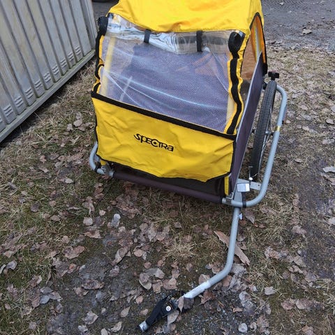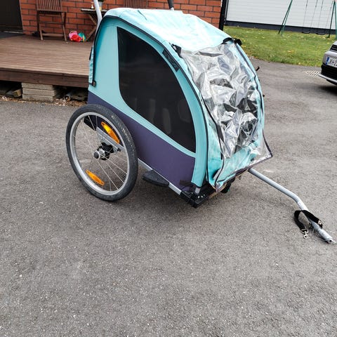 Matkaaja merkkinen pyöräkärry. Kärry on kaksipaikkainen. Pyöräkärryn päällä on verkkokankaalle sadesuoja, jonka saa rullattua auki. Takana pieni kuljetustila. Hyvässä kunnossa.