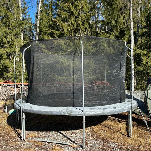 Myydään lasten kasvun vuoksi tarpeettomaksi jääneenä. Kunto hyvä, suojaverkko ja tramppamatto ovat ehjiä. Suojaverkon kiinnikelenkkejä on operoitu (varmasti heikompi kuin tehtaan solmu (näitä kiinnikelenkkejä saa Aconilta uusia - kuten muitakin varaosia)).